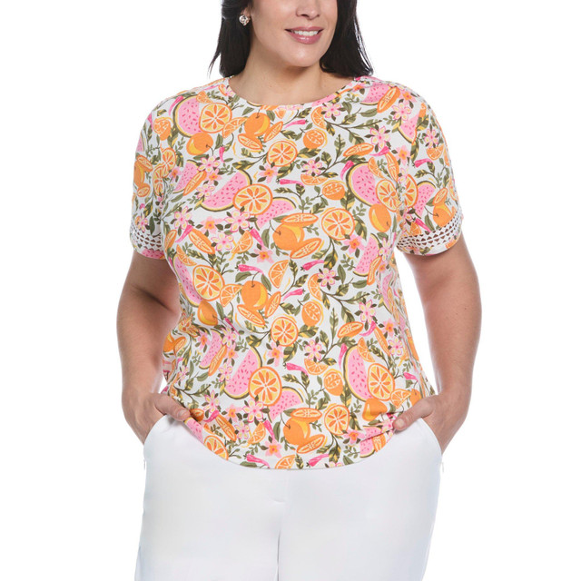 Printed with a fun fruit pattern, this Plus Size Rafaella® short-sleeve top will be a sweet and refreshing addition to your casual wardrobe. Great for sunny spring and summer days, the top is crafted from soft, breathable 100% cotton fabric for cool comfort. Ribbing gives the fabric a classic textured look, while dot lace inserts along the shoulders and sleeve openings add an elegant finishing touch.