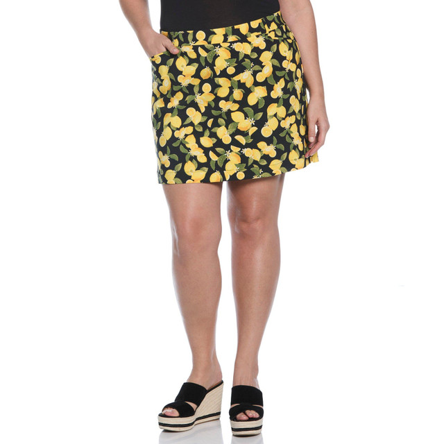 Rafaella's versatile skort is designed for comfort and style. Made from soft and stretchy rayon, it features a classic fit with front welt pockets and belt loops. The side slit hem adds a touch of elegance, while the pull-on design with elasticated waistband ensures a comfortable and easy wear. Built-in mesh shorts provide coverage, and the eye-catching lemon print adds a pop of color. With a flattering length, this skort is perfect for any casual occasion. Length: 18 inches.