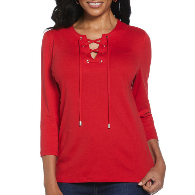 The Women's 3/4 Sleeve Lace-Up Top features a stylish split neckline with a laced closure, adding a trendy touch to your wardrobe. Crafted from soft cotton with rib knit fabrication, it offers texture and comfort. The straight hemline provides a flattering fit, and it's easy to care for with machine wash. Perfect for casual days or layering.