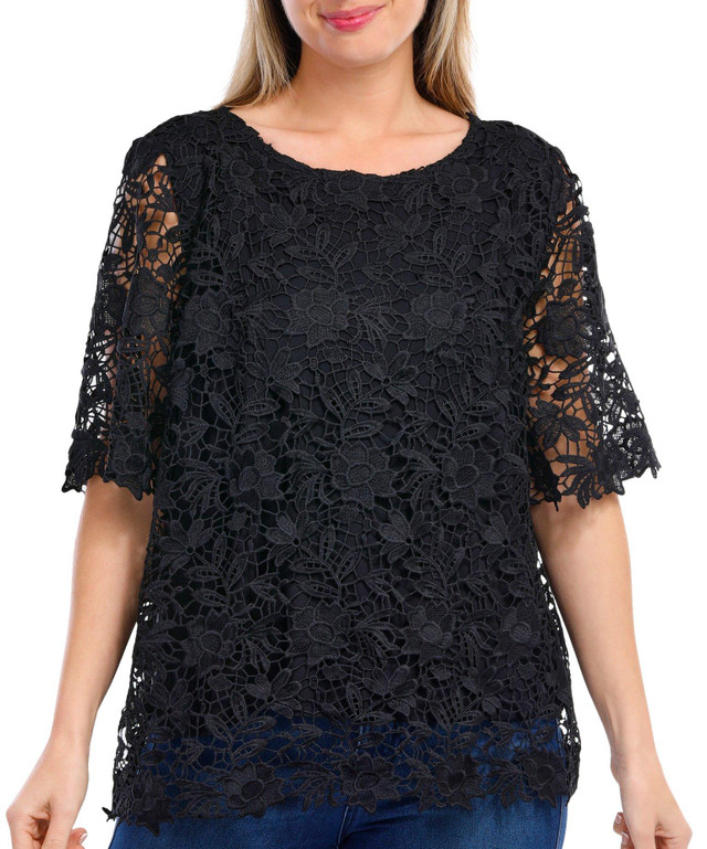 Discover elegance with this Short Sleeve Top, featuring a delicate lace outer layer that adds a touch of sophistication to your look. The lined interior ensures comfort and modesty, making it perfect for any occasion. Whether you're dressing up for a special event or adding a bit of charm to your everyday attire, this top is a versatile addition to your wardrobe. Fabrication is 95% polyester, 5% elastane.