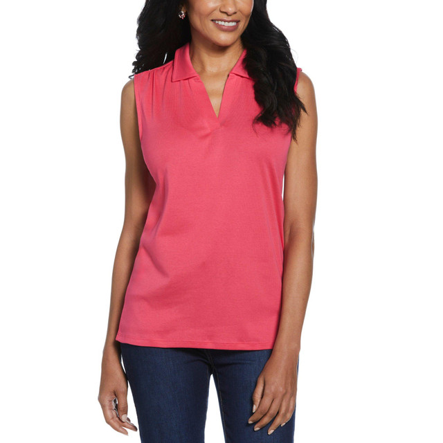 Stylish and versatile, this solid-colored v-neck polo is ideal for everything from sunny strolls through the park to busy days at the office. A metal logo charm at the left chest adds an eye-catching accent to the design.