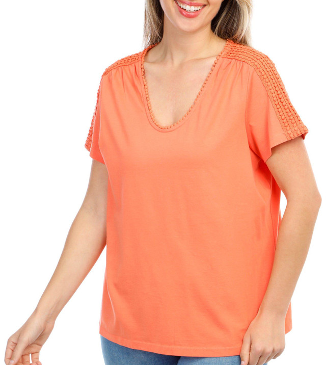 his short sleeve top features a solid color design on lightweight knit fabric, a V-neckline with decorative shoulder detail, and classic styling. The top length measures approximately 27 in.