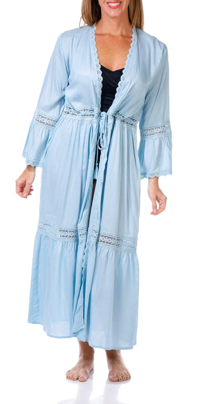 This womens long sleeve coverup features lace detail and a tie front, designed in a flowing kimono style for an elegant beach or poolside look. Body fabrication is 100% rayon, lace fabrication is 100% cotton.