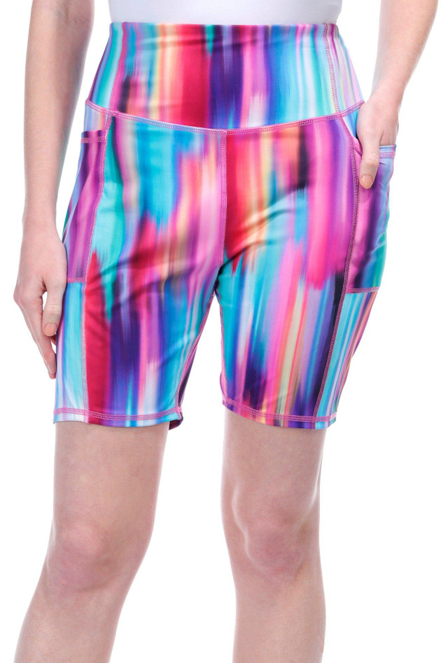 Hit the road in style! These bike shorts feature a sleek print design and are the epitome of active fashion. The performance-oriented waistband ensures a snug, flattering fit, while the lightweight stretch knit fabric provides unparalleled comfort. Ideal for any cycling adventure, theyre a staple piece for the fashion-forward cyclist who values both style and functionality. Two side pockets. Inseam measures approximately 8 in. Fabrication 77% nylon, 33% spandex.
