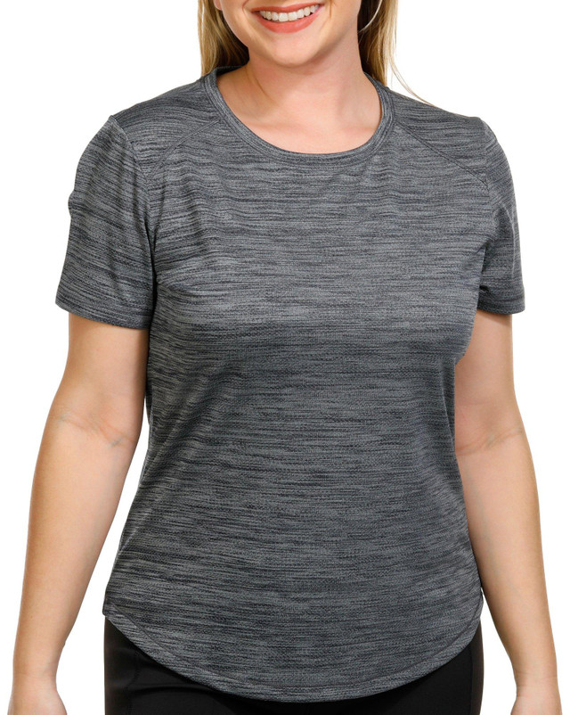 Stay active and stylish with our lightweight, stretchy top. The round neckline and vented short sleeves ensure comfort, while the solid colors complement any outfit. Perfect for workouts or daily wear! The front length measures approximately 25 in. Fabrication 100% polyester.