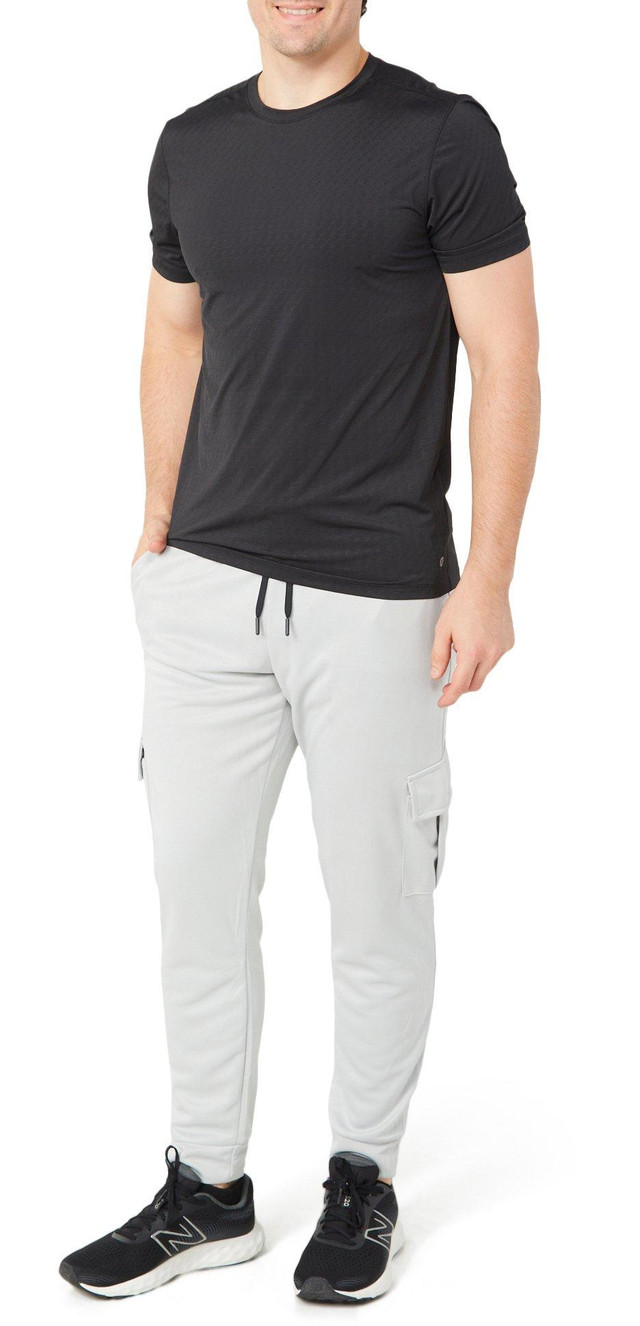 This two piece mens set features a casual performance tee and cargo jogger pants made with stretchy moisture wicking fabric. Designed for comfort and movement whether on the go or relaxing. A versatile choice for active and everyday wear. Fabrication is 90% polyester and 10% spandex.