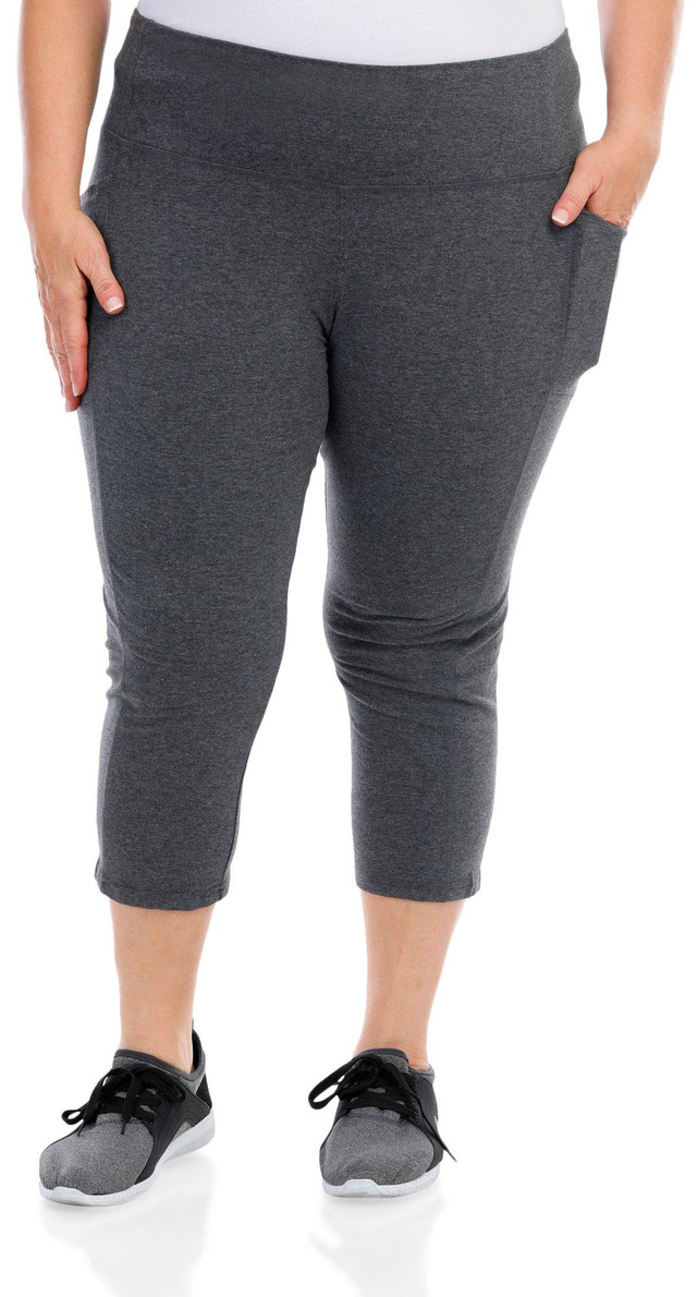 Enhance your workout wardrobe with these Active Capris. These capris feature a sleek solid color and convenient double side pockets, perfect for storing your essentials while on the go. The soft, stretchy fabric ensures a comfortable fit and allows for easy movement, making them ideal for any activity, from yoga to running errands. Fabrication is 55% cotton, 37% polyester, 8% spandex.
