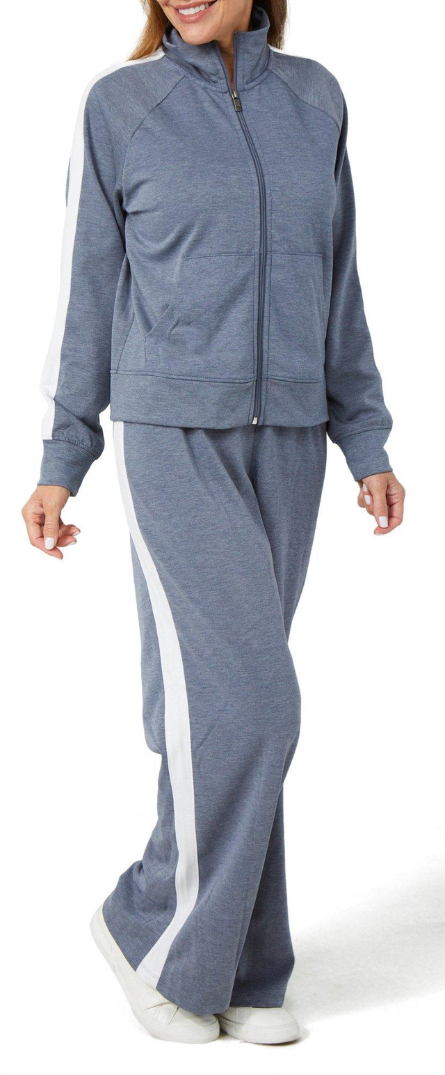 Stay active in style with this Women's Active 2-Piece Scuba Sweatpants Set. Featuring a long sleeve zip-up hooded jacket and matching sweatpants with bold white striped detail, this set blends sporty flair with everyday comfort. Fabrication 82% polyester, 13% rayon, 5% spandex