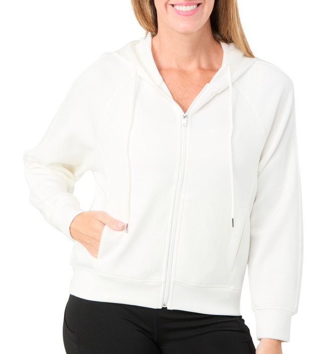 Elevate your activewear with this Active Scuba Jacket. Crafted from soft scuba fabric, this jacket offers unparalleled comfort and style. The full-zipped jacket features double front pockets, perfect for keeping essentials close. Fabrication is 45% polyester, 50% rayon, 5% spandex.