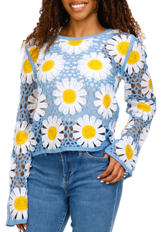 Add a touch of charm to your wardrobe with our Juniors Long Sleeve Crochet Daisy Top. Made from 100% acrylic, this top features a stylish crochet daisy design that adds a delicate and feminine touch. The round neckline and long sleeves provide a classic look, making it perfect for layering. Ideal for any casual outing or as a cozy layer, this top is a versatile and chic addition to your collection.