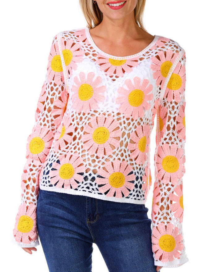 This Long Sleeve Crochet Top with daisy designs is a charming and elegant addition to your wardrobe. The intricate crochet work showcases beautiful daisy patterns, adding a touch of femininity and sophistication. Perfect for layering or wearing on its own, this top combines style and comfort effortlessly. Ideal for a casual day out or a special occasion, it brings a unique and delicate flair to any outfit. Top length measures approximately 22 in.