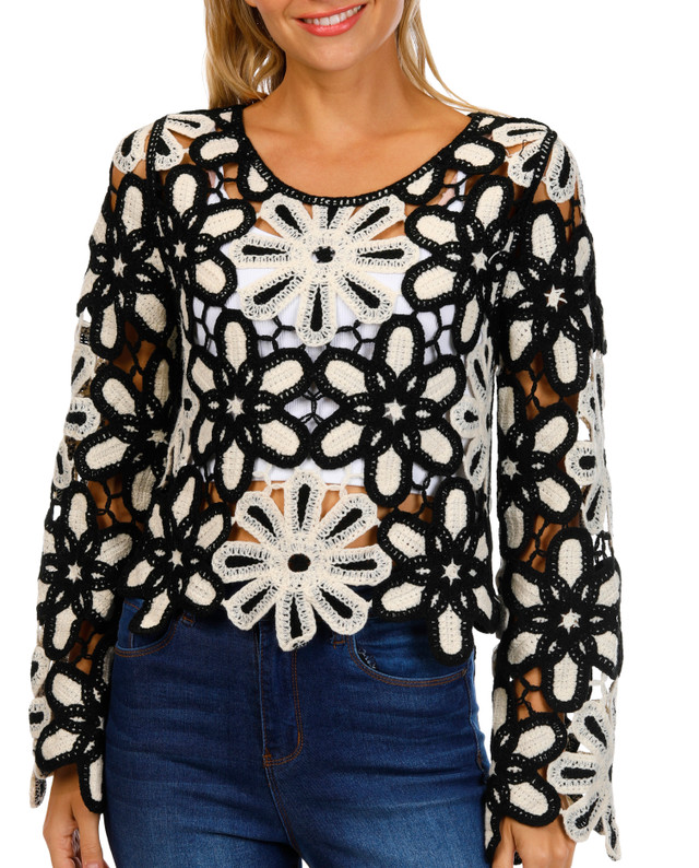 Add a touch of charm with this juniors long sleeve floral crochet top. Made from 100% acrylic, it features a delicate crochet design that blends comfort with style. Perfect for casual wear and everyday outfits. Easy to care for with machine wash and tumble dry.