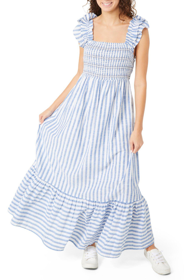 Elevate your everyday look with the Juniors Ruffle Sleeve Tiered Maxi Dress. Designed with soft ruffle sleeves, a flattering square neckline, and a tiered skirt, this striped-color maxi offers effortless style and flowy comfort for any occasion. Fabrication 32% polyester, 65% cotton, 3% lurex.
