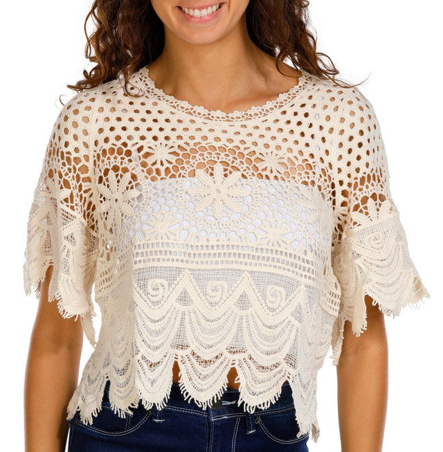 The Juniors Short Sleeve Crochet Crop Top is a charming and trendy addition to your wardrobe. Made from 100% cotton, this top features a stylish solid color, a classic crew neckline, and a delicate scalloped hem. Its cropped length makes it perfect for pairing with high-waisted jeans or skirts, adding a touch of elegance to any casual outfit. Embrace a chic and playful look with this delightful crochet crop top.