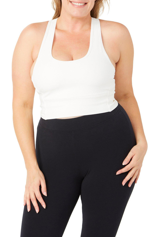 This womens sports bra is crafted from honey ribbed fabric for texture and style. It features a scoop neckline, racerback design, and a cropped fit, all in an easy-care material for everyday wear. Fabrication is 75% nylon and 25% spandex.