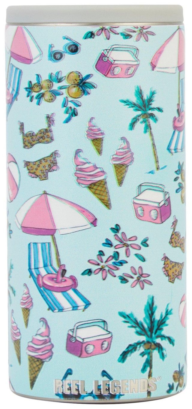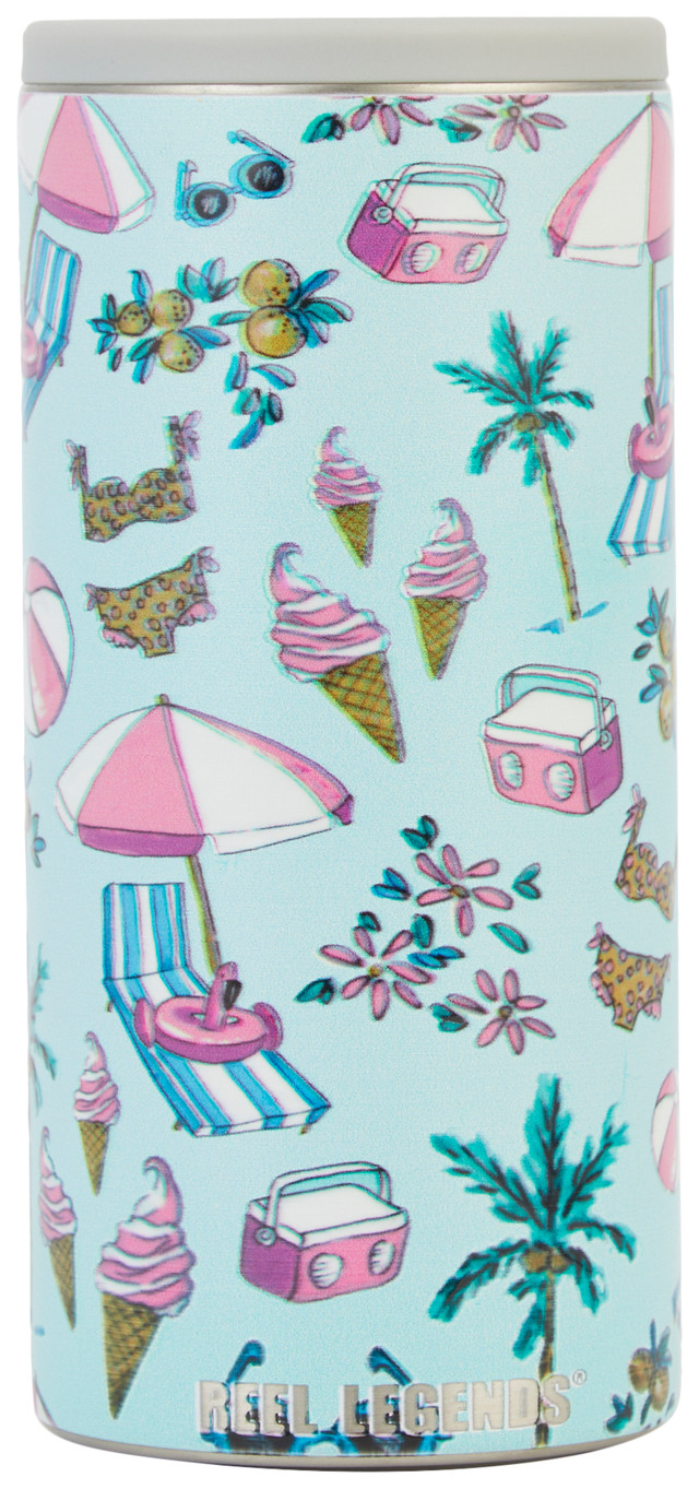 Sip in style with this slim can cooler featuring the playful beach happy design. Made from durable stainless steel, it keeps your drink chilled and fits most slim cans perfectly. Ideal for beach days, poolside lounging, or casual get-togethers. Hand wash only to maintain its finish and quality.