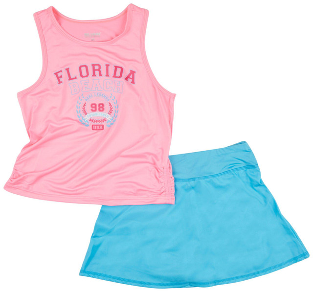 Our Big Girls Active 2 Pc Skort Set is made from a stretchy polyester-spandex blend for all-day performance. Featuring a racerback tank with a Florida-inspired screen print and a solid skort, this set offers UPF 30 protection and flexible comfort for active days in the sun.
