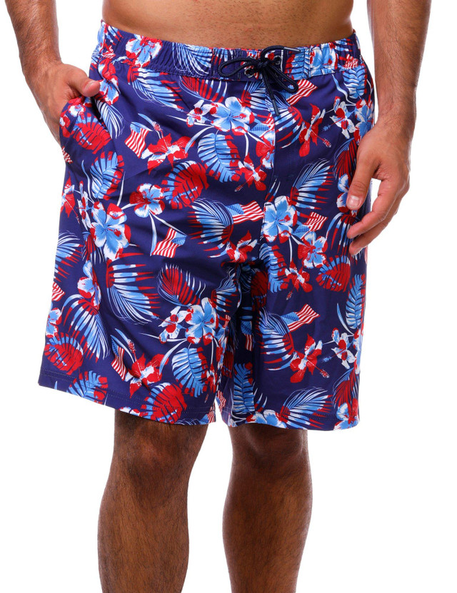 Make a bold statement with the Americana Print E-Board Swim Trunks. Featuring vibrant and patriotic patterns, these trunks are crafted from quick-dry fabric with a built-in mesh brief, elastic waistband, and secure drawstring for all-day comfort and coverage in and out of the water. Inseam measures 9 in.
