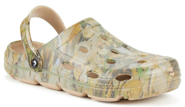 Tackle comfort and style in these mens camo clogs. Featuring a breathable, perforated design with a rugged camouflage print, these slip-ons are built for all-day wear. The pivoting backstrap offers a secure fit, while the cushioned sole provides lightweight supportperfect for outdoor activities, casual wear, or lounging.