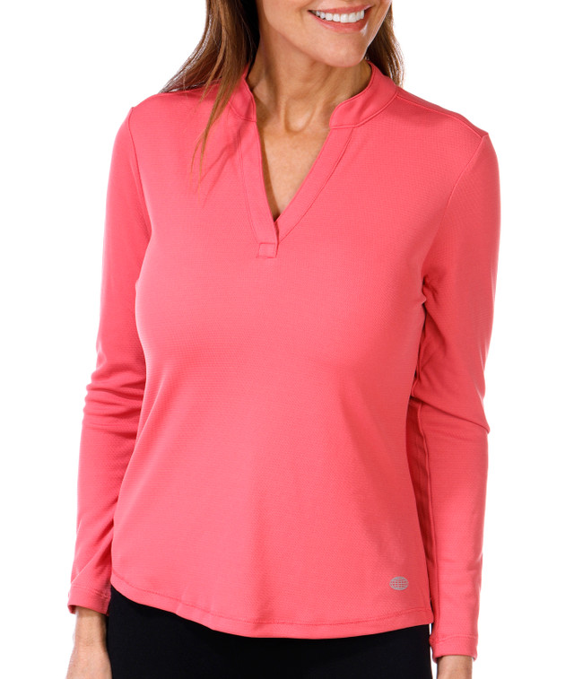Reel Legends Freeline styles provide moisture management technology, quick dry properties, and UPF 50 sun protection. This long sleeve top features a solid color design on soft lightweight freeline fabric line running through, a split v-neckline, solid color for effortless matching, curved back hemline for flattering look, and comfortable fit. The top length measures approximately 23 in. from shoulder to front hemline (26 inches from shoulder to back hemline). Fabrication 100% polyester.