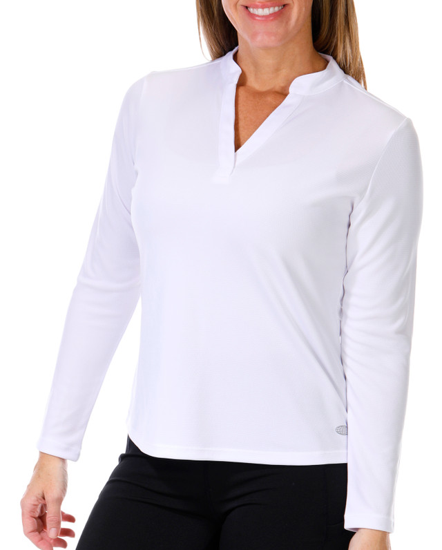 Reel Legends Freeline styles provide moisture management technology, quick dry properties, and UPF 50 sun protection. This long sleeve top features a solid color design on soft lightweight freeline fabric line running through, a split v-neckline, solid color for effortless matching, curved back hemline for flattering look, and comfortable fit. The top length measures approximately 23 in. from shoulder to front hemline (26 inches from shoulder to back hemline). Fabrication 100% polyester.