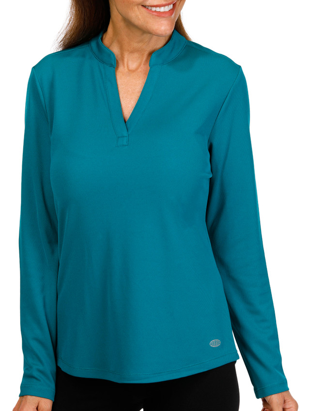 This petite long sleeve fishing top is designed with sun protection, quick dry, and moisture wicking features to keep you cool and comfortable. It comes in a solid color with a split neck, making it both functional and stylish for outdoor activities. Fabrication is 100% polyester.