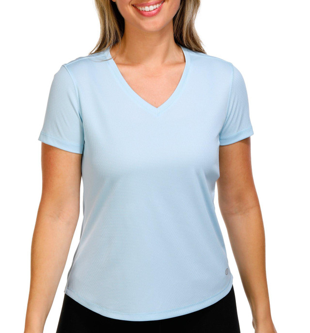 Embrace the outdoors with our Reel Tec Freeline top for women. Crafted with a solid color design, this lightweight textured top offers UPF 30 sun protection. The v-neckline and short sleeves add a touch of style, while the quick-dry, moisture-wicking fabric ensures comfort during any activity. The top length measures approximately 26 in. Fabrication 100% polyester.