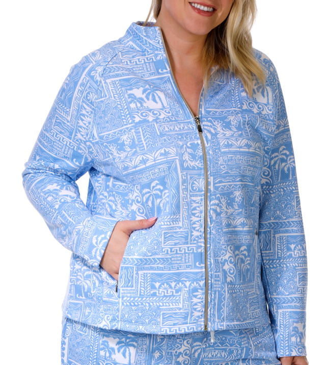 This Plus French Terry Full Zip Print Jacket is designed for comfort and active style. Made from 60% cotton and 40% polyester, it offers breathable softness with durable wear. The full zip front makes it easy to layer, while zipped front pockets provide secure storage for essentials. With a length measuring approximately 27 inches, it delivers a flattering fit that is perfect for outdoor activities or casual outings.