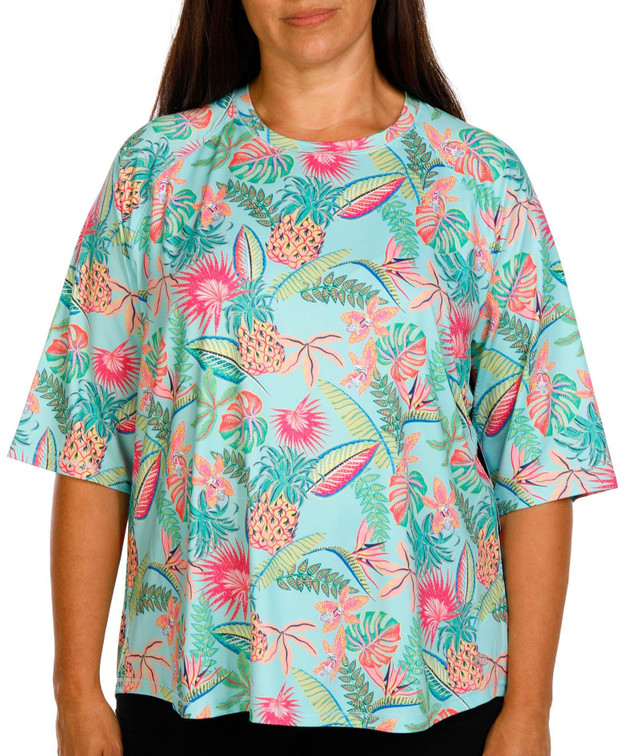 Discover the outdoors in this top! The scallop print design exudes tropical charm. Made from soft, lightweight stretch knit fabric, this top ensures maximum comfort and flexibility for all your outdoor adventures. A round neckline adds a touch of classic style, making it perfect for both active and casual wear. Embrace the outdoors in style with this versatile and elegant piece. Fabrication is 92% recycled polyester, 8% spandex