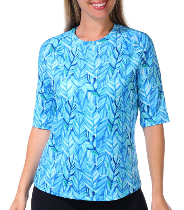 Discover the outdoors in this top! The palm leaf print design exudes coastal charm. Made from soft, lightweight stretch knit fabric, this top ensures maximum comfort and flexibility for all your outdoor adventures. A round neckline adds a touch of classic style, making it perfect for both active and casual wear. Embrace the outdoors in style with this versatile and elegant piece. Fabrication is 92% recycled polyester, 8% spandex