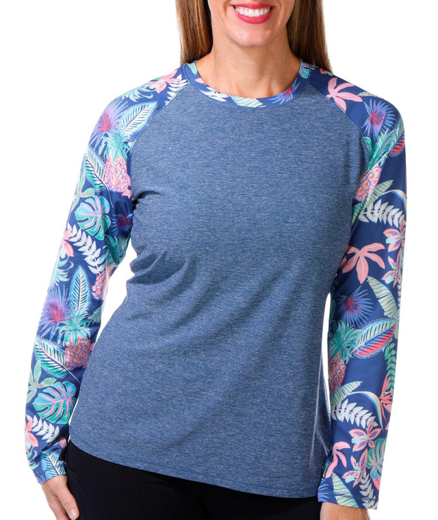 Our Women's Reel-Tec Raglan Sleeve Top is designed to support an active lifestyle with its performance-driven features. Made from lightweight Reel-Tec fabric, this crew neck top features a heathered look, tropical floral print raglan sleeves, UPF 50+ sun protection, moisture wicking, sun activated cooling tech, and quick dry material. Fabrication 92% polyester, 8% spandex