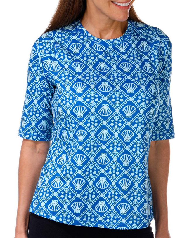 Discover the outdoors in this top! The stylish print design exudes coastal charm. Made from soft, lightweight stretch knit fabric, this top ensures maximum comfort and flexibility for all your outdoor adventures. A round neckline adds a touch of classic style, making it perfect for both active and casual wear. Embrace the outdoors in style with this versatile and elegant piece. Fabrication is 92% recycled polyester, 8% spandex.