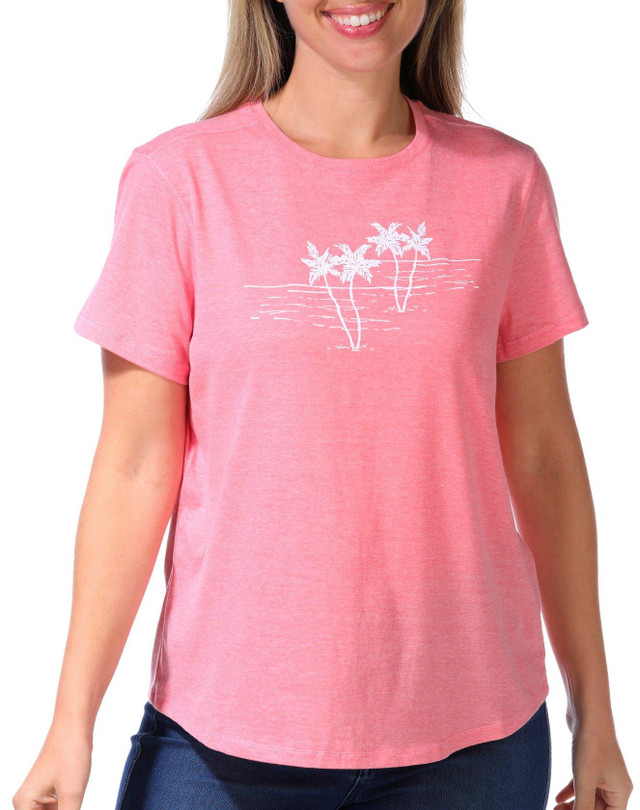 This women's relaxed top features a breezy palm tree graphic that brings a touch of the tropics to your everyday style. With a crew neckline and short sleeves, it offers a laid-back fit perfect for warm weather and casual comfort. Fabrication 60% cotton, 40% polyester