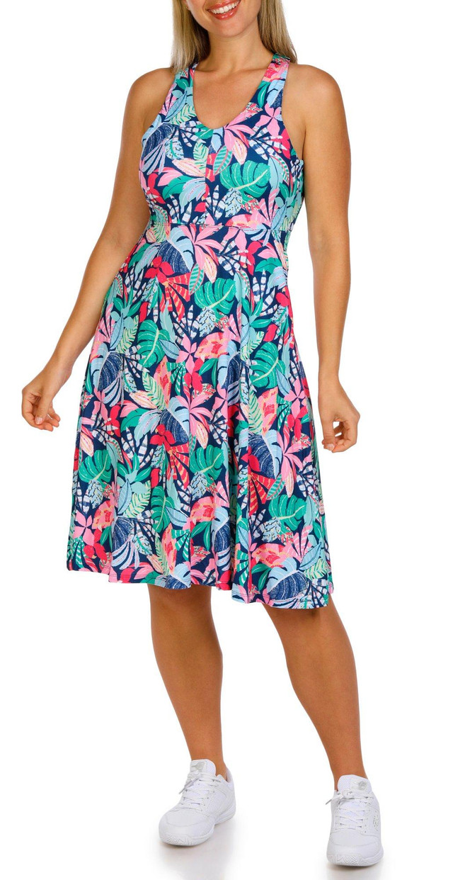 The Women's Active Floral Print Dress offers a perfect blend of comfort and style. Made from a soft and stretchy blend of 88% polyester and 12% spandex, this 48-inch dress provides a flattering fit that moves with you and features performance stretch, UPF 50 protection, moisture wicking, cooling tech, quick dry and a built in bra.