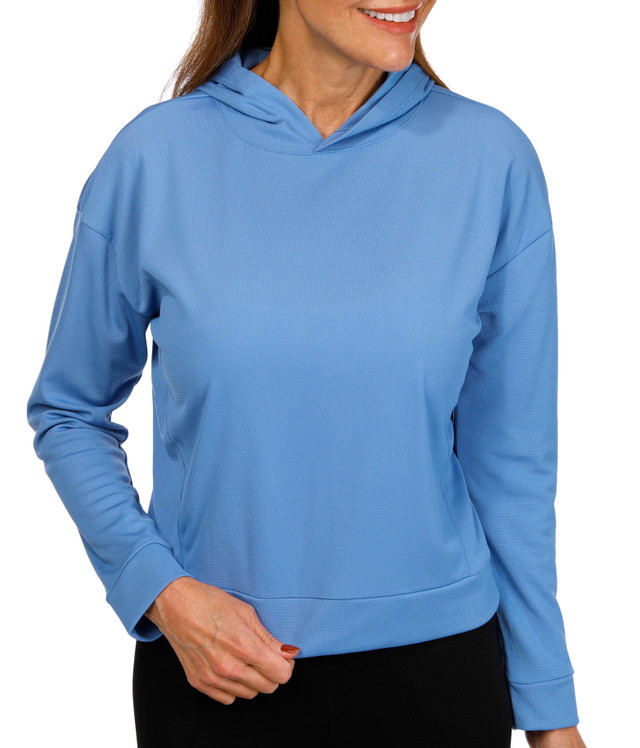 Reel Legends offers performance designs to support the active lifestyle. This hoodie long sleeve top features a solid color design on lightweight freeline fabrication like line running through, banded hemline, seamed styling design for flattering fit, and solid color that allows for effortless matching. Top length measures approximately 24 in. length from shoulder to back hemline. Fabrication is 100% polyester.