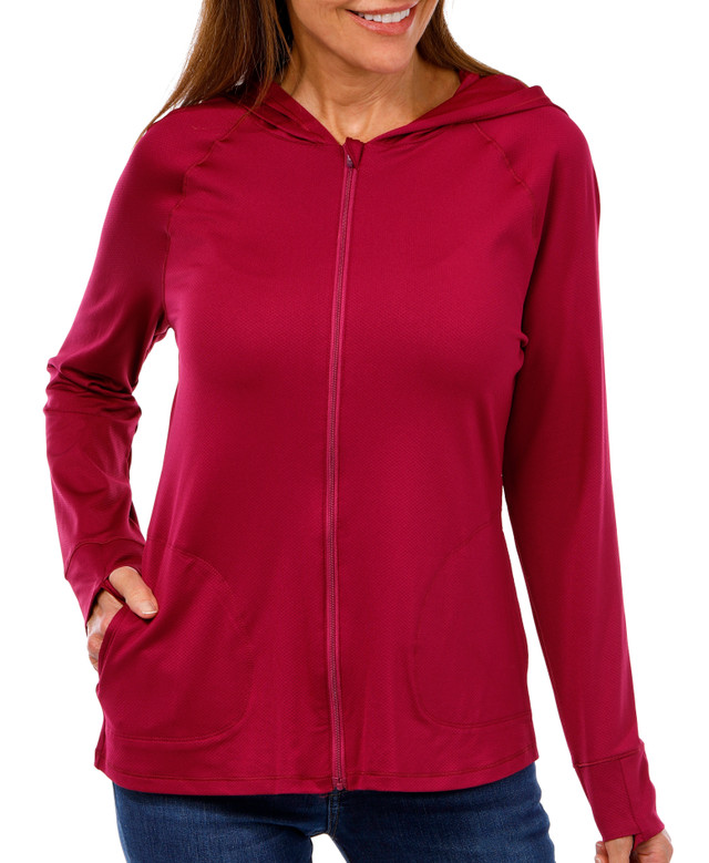 The Women's Ideal Temp Long Sleeve Zipped Hoodie is designed to support an active lifestyle with its performance-driven features. Made from lightweight fabric, this hoodie features a solid color, full zipper front zip closure, UPF 50+ sun protection, moisture wicking, sun activated cooling tech, and quick dry material. Fabrication 84% nylon, 16% spandex. Measures approximately 22 inches.