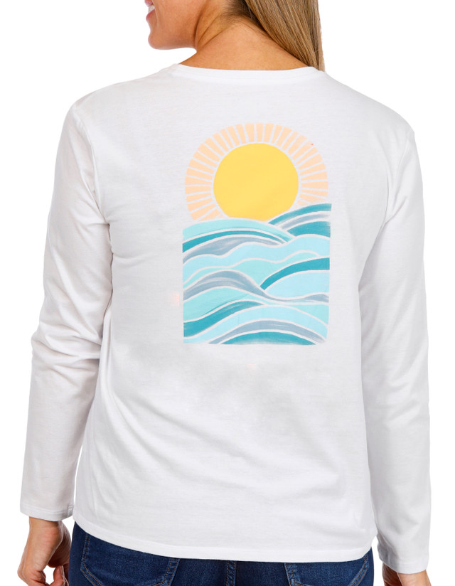 Bring coastal ease to your everyday look with the Womens Long Sleeve Seabreeze Graphic Tee. Featuring soft cotton fabric, long sleeves, and a classic crew neckline, this solid style showcases a small front graphic and a larger back design of the sun rising over the water. Perfect for casual days or layering. Fabrication is 100% cotton. Length measures approximately 24 in.