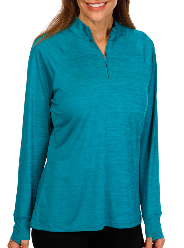 This long sleeve top features a solid color design on lightweight fabric like line running through, a quarter length zip, solid color for effortless matching, and comfortable fit. Fabrication 92% polyester, 8% spandex. Measures approximately 22 inches.