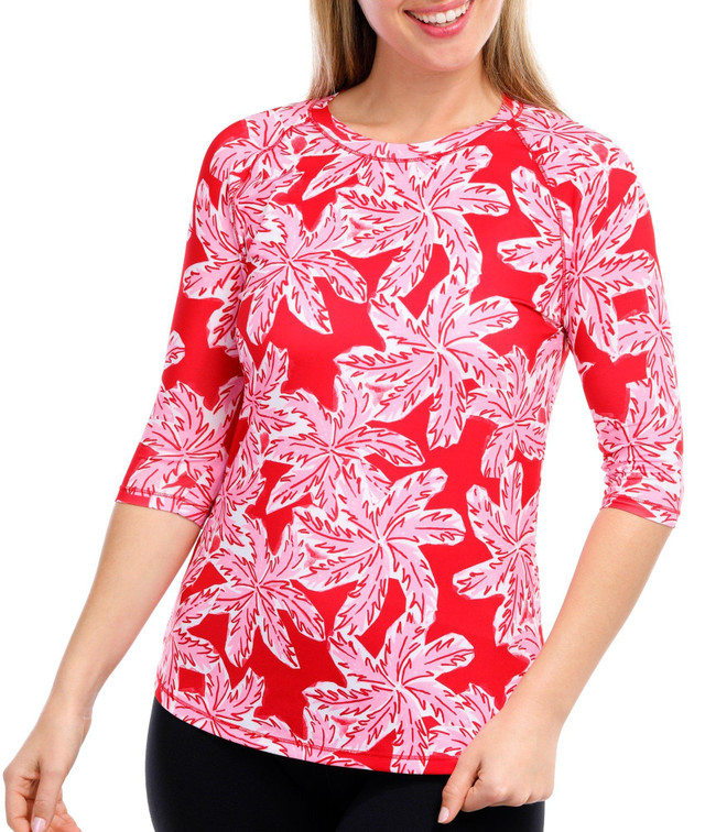 Discover the outdoors in this top! The bright abstract print design exudes tropical charm and foliage. Made from soft, lightweight stretch knit fabric, this top ensures maximum comfort and flexibility for all your outdoor adventures. A round neckline adds a touch of classic style, making it perfect for both active and casual wear. Fabrication 92% recycled polyester, 8% spandex.