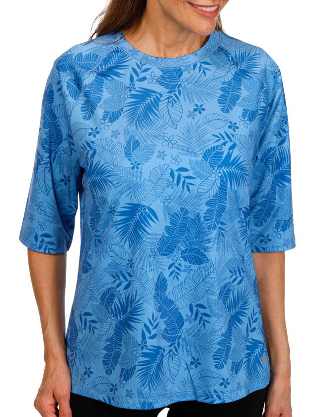 Discover the outdoors in this top! The stylish print design exudes coastal charm. Made from soft, lightweight stretch knit fabric, this top ensures maximum comfort and flexibility for all your outdoor adventures. A round neckline adds a touch of classic style, making it perfect for both active and casual wear. Embrace the outdoors in style with this versatile and elegant piece. Fabrication is 92% recycled polyester, 8% spandex.