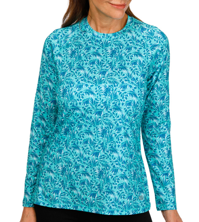 Reel Legends apparel is perfect for any land or sea adventure. This Reel-Tec top features a print design on lightweight stretch smooth satin touch knit fabric, long solid sleeves, a round neckline, moisture-wicking, quick-dry, and sweat-activated technologies, snag resistance, and UPF 50 sun protection. The top length measures approximately 26 in. Fabrication 92% recycled polyester, 8% spandex.