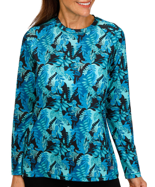 Reel Legends apparel is perfect for any land or sea adventure. This Reel-Tec top features a print design on lightweight stretch smooth satin touch knit fabric, long solid sleeves, a round neckline, moisture-wicking, quick-dry, and sweat-activated technologies, snag resistance, and UPF 50 sun protection. The top length measures approximately 26 in. Fabrication 92% recycled polyester, 8% spandex.