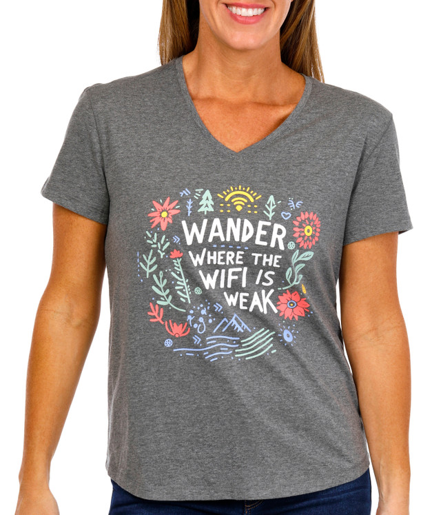 Add an easygoing vibe to your wardrobe with the Womens Relaxed Fit Wander Graphic Tee. Featuring a flattering V neckline and short sleeves, this soft relaxed silhouette pairs effortlessly with jeans, shorts, or layered looks. The graphic reading Wander Where the WIFI is Weak brings a laid back touch to any casual day. Fabrication is 60% cotton 40% polyester. Length measures approximately 25 in.