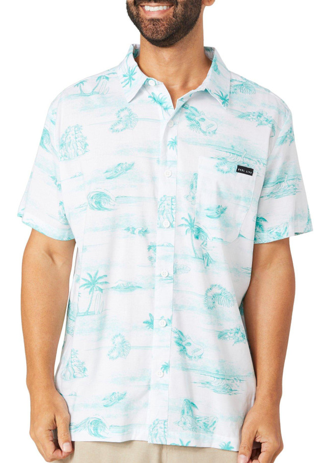 Keep it cool and casual with the Men's Pacific Woven Button Down Shirt. Crafted from a breathable cotton-rayon blend, it features a button-down front, short sleeves, collared neckline, and a chest slip pocket.