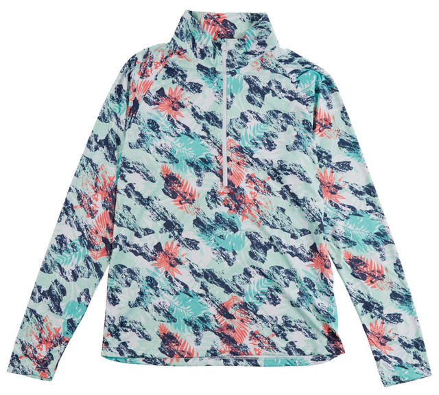 Stay cool and protected in this womens 1/4 zip Jax top featuring long sleeves and a vibrant tropical print. Made with lightweight, moisture-wicking fabric and UPF sun protection, its perfect for active days outdoors. The zip neckline adds style and versatility, making it ideal for workouts, hikes, or casual wear.