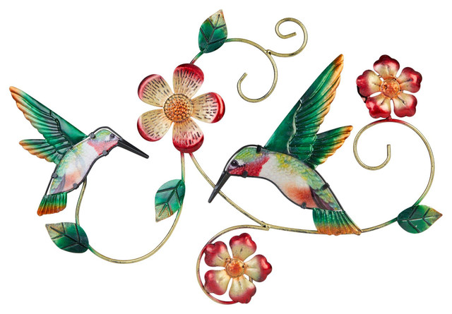 Add elegance to outdoor decor with the 24 in Hummingbird Gardenscape Wall Art featuring a detailed metal design with hummingbirds and floral accents. Crafted for garden walls patios or sunrooms. Fabrication is 100% metal. Measures approximately 24 in x 17 in x 1 in.