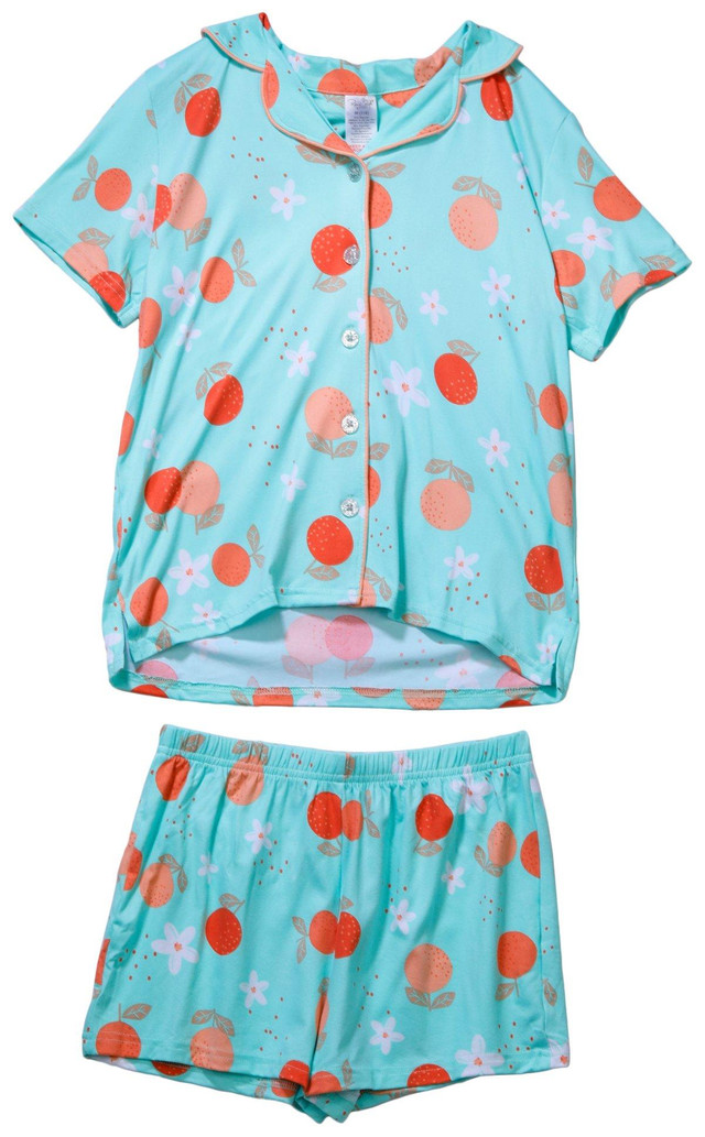 This pajama set is made from a soft and stretchy blend of 95% polyester and 5% spandex for all-night comfort. Featuring a fun orange print, its perfect for bedtime or lounging. Easy to care for machine wash and tumble dry.