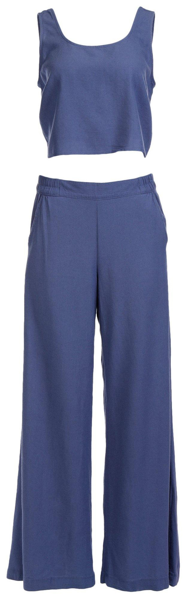 Introducing our Juniors 2 Pc Crop Tank Top Set, crafted from a blend of cotton, linen, and rayon. This stylish set features a solid scoop neck cropped tank top paired with matching wide leg pants. The pants include side seam pockets and a pull-on waistband for added comfort and convenience. Perfect for a chic and effortless look, this set is ideal for any casual summer outing or relaxed day at the beach.