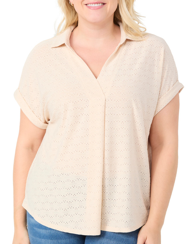 This plus-size top features a solid color and a stylish Johnny collar, with short sleeves and an all-over eyelet design that adds texture and charm. Lightweight and breathable, it is perfect for warm days and easy to dress up or down. Fabrication 95% polyester, 5% spandex