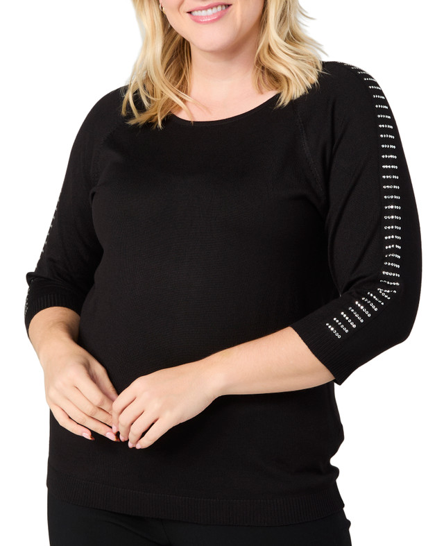 Add a touch of sparkle to cooler days with the Rhinestone Sleeve Sweater. Designed for comfort and style, this soft knit features shimmering rhinestone accents along the sleeves for a chic, eye-catching finish. Fabrication is 70% rayon, 30% polyester.